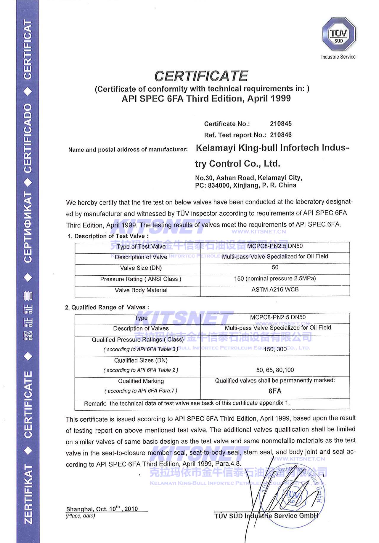 多路閥防火證書API6FA